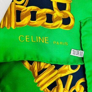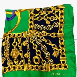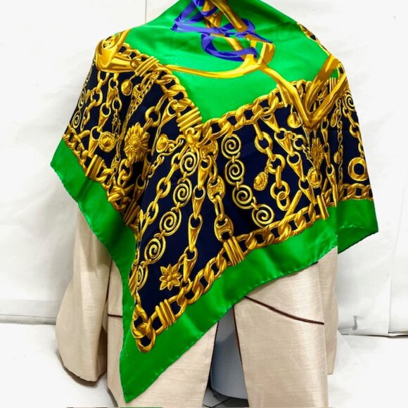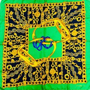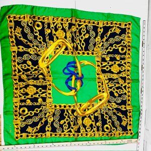 Elegance Soft Celine Paris Scarf 100% Silk 34"x35"Green black Gold Chain(S75