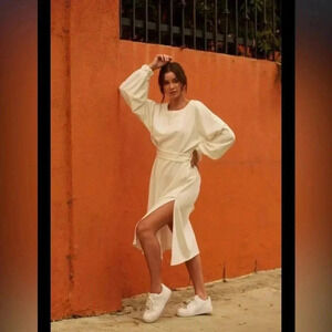 Crafted from high-quality, breathable fabric, this dress ensures comfort while maintaining a chic, polished appearance. The long sleeves and modest neckline make it a versatile choice for any occasion, from daytime outings to evening gatherings. The subtle slit adds a hint of allure, allowing ease of movement and a glimpse of leg.