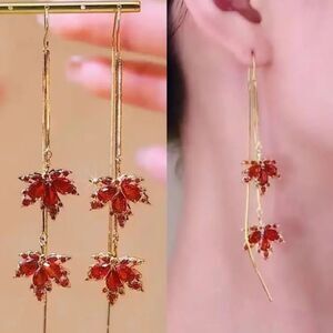 🍁🆕🍁 Elegant 14K Gold Plated Red Maple Leaf Dangle Earrings🍁