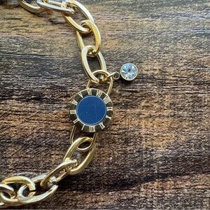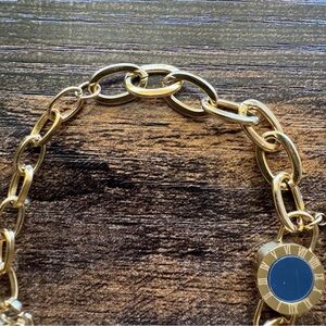 This elegant gold chain bracelet features a striking black disc accent, perfect for adding a touch of sophistication to any outfit. Ideal for both casual and formal occasions.