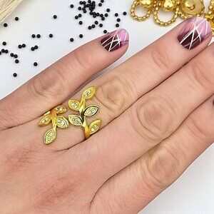 18K gold plated ring, adjustable ring, gold leaf ring, nature-inspired jewelry, open wrap ring, zirconia ring, cubic zirconia jewelry, dainty ring, statement ring, elegant gold ring, trendy jewelry, minimalist ring, gold fashion ring, stacking ring, cocktail ring, holiday gift, Christmas gift, anniversary gift, birthday gift, gift for her, luxury jewelry, timeless jewelry, boho chic ring, modern jewelry, tarnish-free ring, hypoallergenic jewelry, gold plated stainless steel, leaf motif ring, sparkling zircon ring, wedding guest jewelry, bridal jewelry, everyday jewelry, fall fashion, winter fashion, Thanksgiving jewelry, Christmas jewelry, holiday party, Mother's