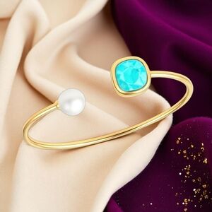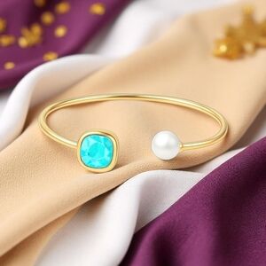 18K gold plated bracelet, minimalist cuff bracelet, stainless steel jewelry, aquamarine crystal bracelet, faux pearl bracelet, dainty gold bangle, trendy open cuff, hypoallergenic jewelry, tarnish-resistant bracelet, elegant gold bracelet, stackable bracelet, gold and pearl bracelet, luxury fashion jewelry, gift for her, adjustable bangle, timeless jewelry, modern minimalist bracelet, spring jewelry trends, summer jewelry, bridal jewelry, wedding guest accessories, anniversary gift, Mother's Day gift, birthday gift, holiday jewelry, trending jewelry 2025, fashion-forward accessories, delicate jewelry, statement cuff bracelet, womenβs gold jewelry, stunning
