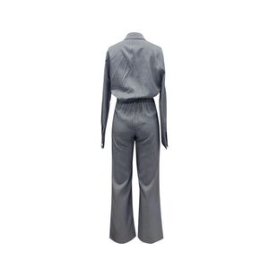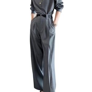 This two-piece polyester blend outfit—a long-sleeve button-up shirt and wide-leg pants—is Ideal for Spring, Summer, and fall. It is casual to dress-up attire. The fabric is 95% polyester and 5% spandex. It's a gorgeous slate-gray color. Belt not included.