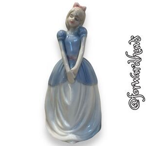 This 5.5-inch porcelain figurine beautifully captures the elegance of a young lady. She is depicted with her hair styled up, adding a touch of sophistication to her appearance. The figurine features a long dress with a blue bodice and a flowing white skirt that gracefully drapes to the base. Her hands are clasped together in front of her, suggesting a formal and poised demeanor.