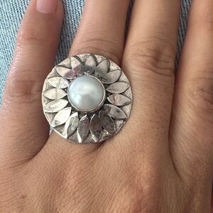 This elegant ring features a stunning floral design in silver with a central white accent. Perfect for adding a touch of sophistication to any outfit.