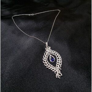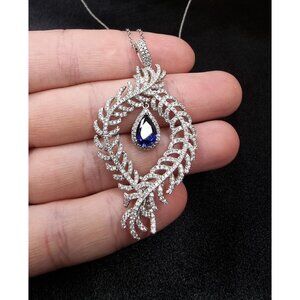 At the heart of the pendant hangs a teardrop-shaped blue gemstone, framed by a halo of sparkling accents. Its deep sapphire-blue hue evokes royalty, wisdom, and mystery, adding striking contrast to the icy brilliance of sterling silver.