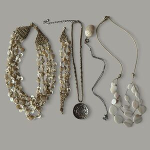 This exquisite necklace set features natural shell elements paired with silver and rope accents, perfect for adding a touch of natural elegance to any outfit. Four necklaces and one bracelet.