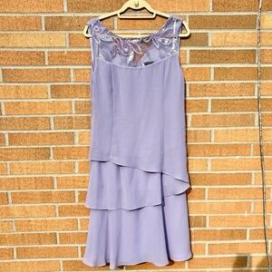 This elegant lavender dress features a layered design with delicate detailing on the neckline. Perfect for any special occasion. 40” long and 19” P2P. Size 14.