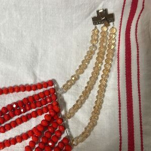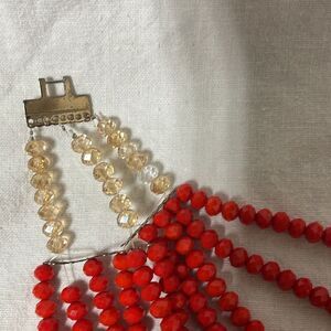 This stunning handmade necklace features vibrant 10 strand red and gold beads with gold tone metal clasp, perfect for adding a touch of elegance to any outfit. Never worn.