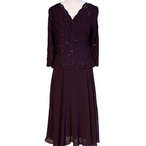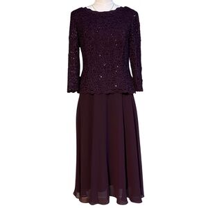 This stunning two-piece look from Alex Evenings features a rich deep purple hue with a sequin lace bodice and flowing chiffon skirt. Perfect for weddings, formal events, or evening occasions.
