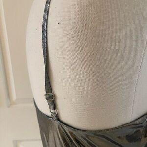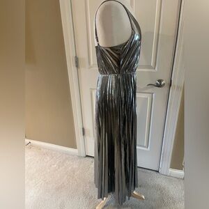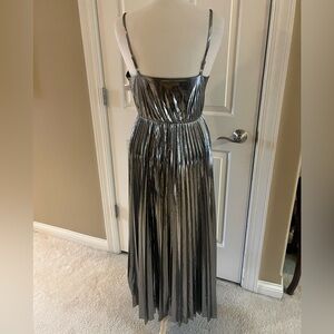 Shimmer in style with this elegant silver maxi dress. Perfect for evening events and special occasions. This is by the brand All Saints. It is brand new with a store tag, but not the brand tag. This is a gorgeous metallic silver sparkle dress with adjustable spaghetti straps. It is 100% polyester and that includes exterior as well as the lining. This dress also has an elastic stretch waist. This is a dress that can also be hand wash and does not have to be dry cleaned. So, brand new, never worn, excellent condition. All of my items are well cared for income from a smoke free home.