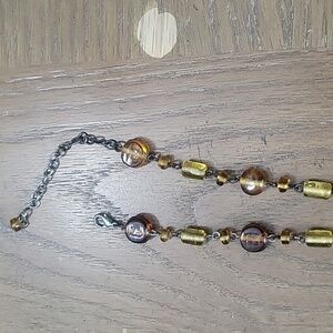 This stunning necklace features a blend of amber and gold glass beads, perfect for adding a touch of elegance to any outfit. The intricate design showcases the beauty of the colors, making it a versatile accessory for any occasion. 8" to pendant and 3" extender.