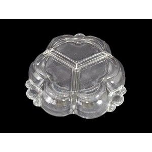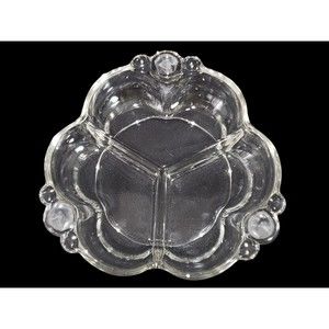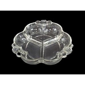 This vintage Canterbury candy relish dish by Duncan and Miller is a beautiful clear glass piece featuring a unique three-leaf clover shape with three divided sections. Measuring approximately 2 inches in height and 7 inches in width, it is adorned with bubble handles and is in excellent condition, free from any cracks, chips, or flea bites, making it a perfect collectible or decorative item for any table setting.