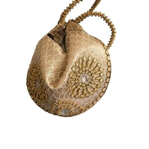 This elegant gold beaded women's bag is perfect for adding a touch of glamour to any outfit. Its intricate design and shimmering gold color make it a standout accessory. Also known as a fortune cookie clutch.