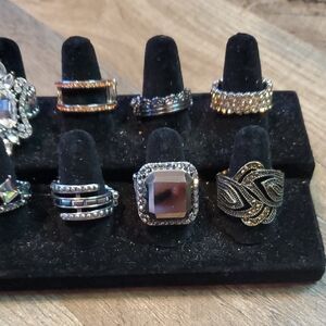 A stunning collection of assorted rings featuring silver, gold, and black tones. Perfect for any occasion. features stretch back fitting sizes 6-11 comfortably. #lot7