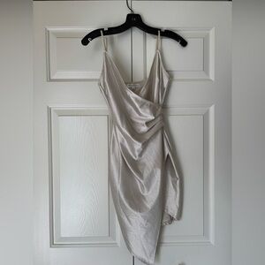 This elegant asymmetrical dress in a stunning cream color is perfect for any occasion. Its unique design adds a touch of sophistication to your wardrobe. Small stain on the back of dress.
