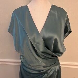 This elegant asymmetrical dress in a stunning teal shade is perfect for any occasion. The flowing design adds a touch of sophistication to your wardrobe.