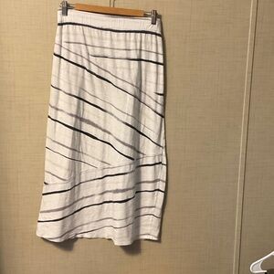 Discover elegance with this asymmetrical white skirt featuring bold black stripes. Perfect for adding a touch of sophistication to your outfit.