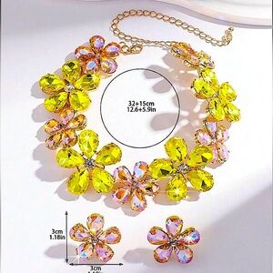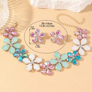 This stunning jewelry set features a vibrant array of colors, including pink, blue, green and gold. The intricate flower design adds a touch of elegance to any outfit. Perfect for special occasions or adding a pop of color to your everyday look.