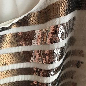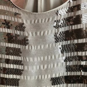 Bronze and clear sequins BCBG sleeveless gown in great condition. Classic fit with a back slit and knotted racerback. No noticeable patches of sequins missing. Some minor snags in the back as shown. It's an XS but I feel like it runs big because it hangs off me - or perhaps that's the style? FYI, I'm about 5'5 and the length isn't too long with heels. Stun at any formal event! PS: Sequins snag onto each other so I'll do my best to package it so it doesn't but be careful when opening!!