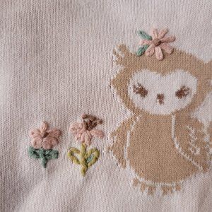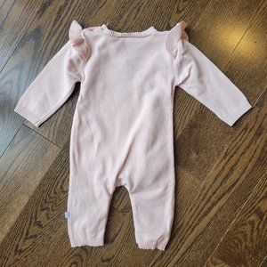 Gorgeous knit baby girl jumpsuit with bird and crochet flower detail. Ruffle detail at the shoulder and button clousure at the neck. Snap fasteners at the bottom for easy diaper changes. Super soft and comfy!