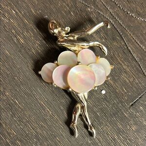 This exquisite brooch features a graceful ballerina design adorned with shimmering mother of pearl accents. The silver-toned finish adds a touch of elegance, making it a perfect accessory for any occasion.