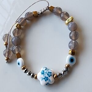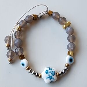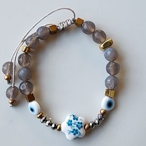 This elegant bracelet features a blend of gray and gold hematite beads, accented with a charming floral centerpiece. Perfect for adding a touch of sophistication to any outfit.