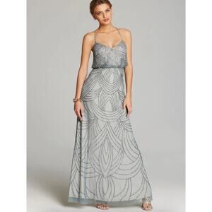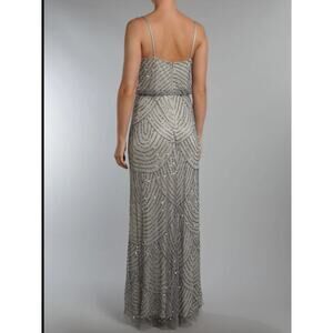 This stunning evening gown features intricate beading in a beautiful gray hue. Perfect for formal occasions, it offers a sophisticated and elegant look. Boob pads have been professionally added