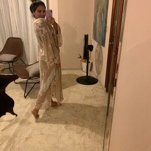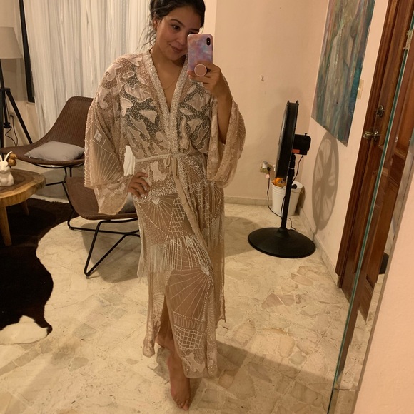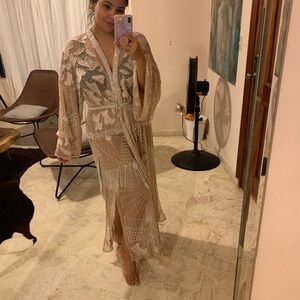 Stunning beige robe with intricate embroidery. Features a tie waist and long sleeves. Perfect for a luxurious feel. Hand beaded, beautiful. Gently use 1 time.