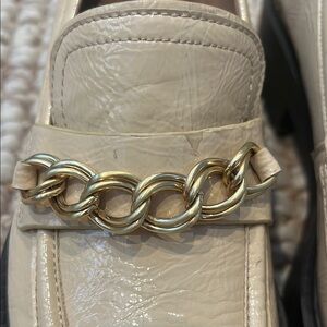 Step out in style with these elegant beige loafers featuring a chic gold chain detail. Perfect for any occasion, these shoes offer both comfort and sophistication. Slight imperfections above the chain. Hardly noticeable. See pics
