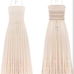 Flowy biege maxi dress with a smocked bodice and ruffled skirt. Perfect for special occasions.