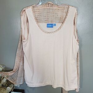 This elegant beige women's top offers a stylish and comfortable fit. Perfect for any occasion. 23 " pit to pit WTH X 30-in overall length. semi sheer front with built-in undershirt button up. pink and taupe grid pattern.
