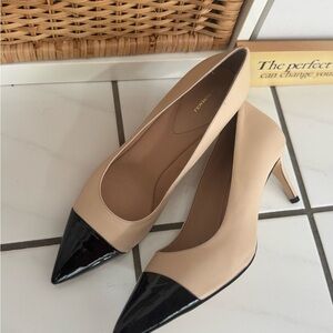 Elevate your classic wardrobe with these Bruno Magli Italian leather pumps. Featuring a timeless nude and black cap toe design, a sleek pointed toe, and elegant mid-height stiletto heel, these shoes embody refined sophistication with luxury comfort.