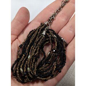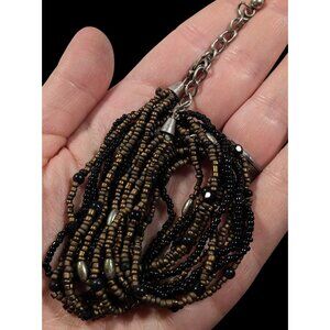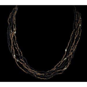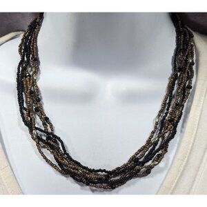 Elegant multilayer necklace featuring black and gold tone glass beads. Perfect for adding a touch of sophistication to any outfit.