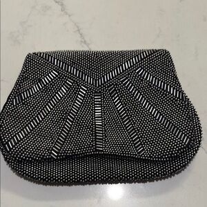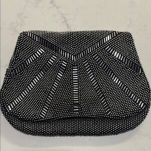 This elegant black beaded clutch is perfect for evening events. Its intricate design adds a touch of sophistication to any outfit. Gently worn