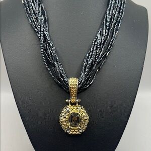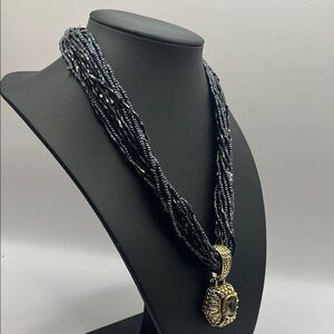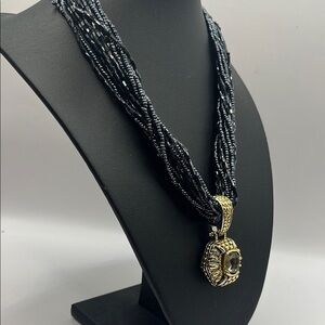 Elegant Black Beaded Necklace with Gold and Silver tone Pendant with Quartz