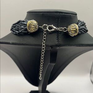 This stunning necklace features a blend of black beads and a striking gold pendant. Perfect for adding a touch of elegance to any outfit.