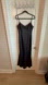 Satin fabric adorned with black beading and rhinestones along the chest and on the front and back of the bottom of the dress. Back of the dress features a low cut back, and ruching.