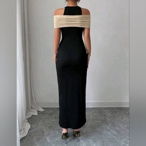 Elegant Black & Beige Color Block Backless High Slit Dress