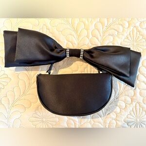 Chic, but whimsical, black clutch adorned with sparkling rhinestones. Perfect for evening events. The large bow is the handle adding something a bit more unique to the profile. No tags, but never used. 8”Wx4”Hx2”D