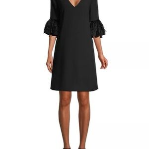 This elegant black dress features stylish feathered sleeves, perfect for any occasion. Its sleek design offers a sophisticated look. Applied feathers adorn the sleeves of this alluring trapeze minidress.