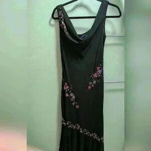 Elegant black formal dress with floral sequin detail. Size 10