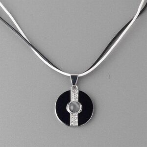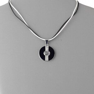 Elegant Black Enamel and Austrian Crystal Rhinestones Round Pendant Necklace