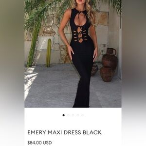 This stunning black evening dress features a unique cut-out design, perfect for making a statement at any event. Its sleek silhouette offers a flattering fit, ensuring you look and feel your best. Size Medium - fits M to L.