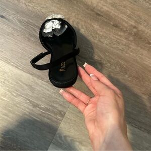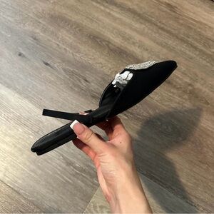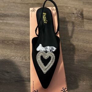 NWOT. These black flats boast a glamorous heart-shaped embellishment made of crystal-like materials, adding a touch of sparkle to their sleek design. Crafted from a luxurious suede-like fabric, they offer a sophisticated and elegant look. The backless design with an ankle strap ensures both style and comfort.