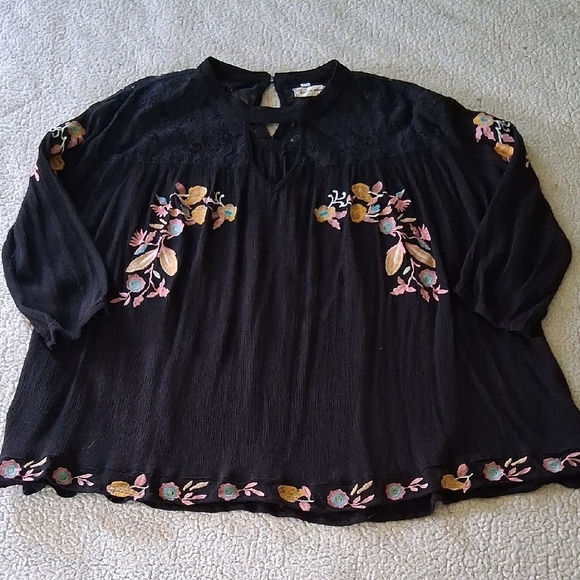 This elegant black blouse features exquisite floral embroidery, perfect for adding a touch of sophistication to your wardrobe. Excellent condition.