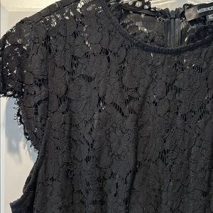 Chic black lace dress with cap sleeves. Perfect for formal occasions. I always got compliments when I wore this! Only worn maybe 4 times. Zipper in back and slit in back. See thru lace at hem and top part of dress. Fully lined.