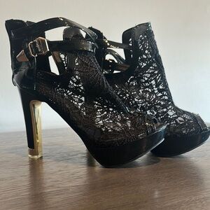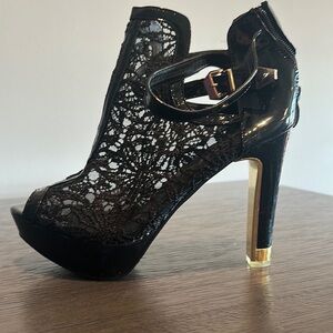 Step out in style with these elegant black lace heels. Perfect for any occasion, these shoes offer a chic and sophisticated look.