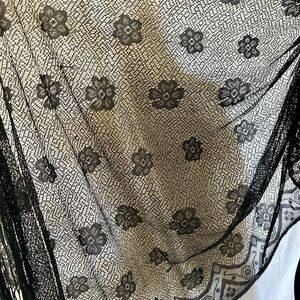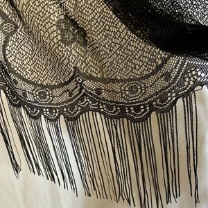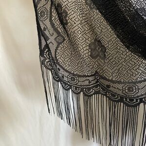 Chic black lace shawl with floral patterns, scalloped edges and fringe