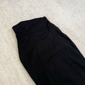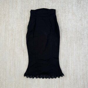 This elegant black skirt features a delicate lace trim, perfect for any occasion. Its sleek design offers a sophisticated look.
